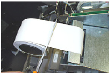 This procedure outlines how to replenish the ATM's receipt paper. Step 1 Open the control panel. If paper remains on roll, cut or tear paper between roll and printer. Step 2 Press the manual feed button to clean remaining paper from feed path. Step 3 Remove spent paper roll and spindle from paper bracket. Step 4 Install new paper roll into spindle. Step 5 Insert paper/spindle into paper bracket. Paper feeds from TOP of roll. Step 6 Feed end of paper into printer take-up slot. Paper will feed automatically through the printer and slightly out front of unit.
